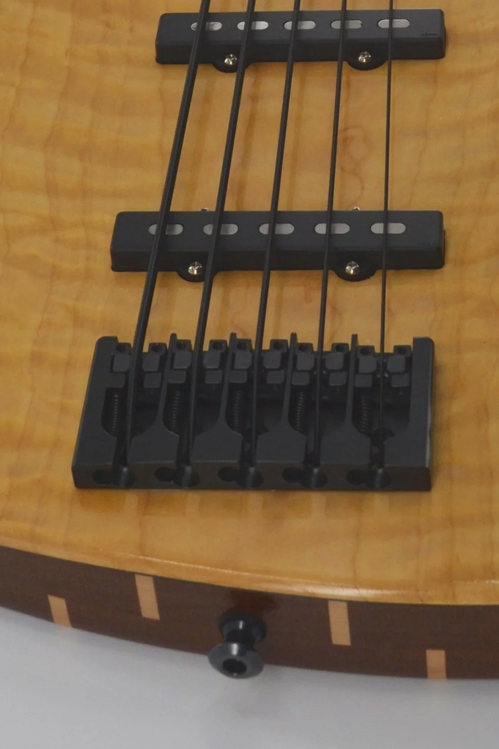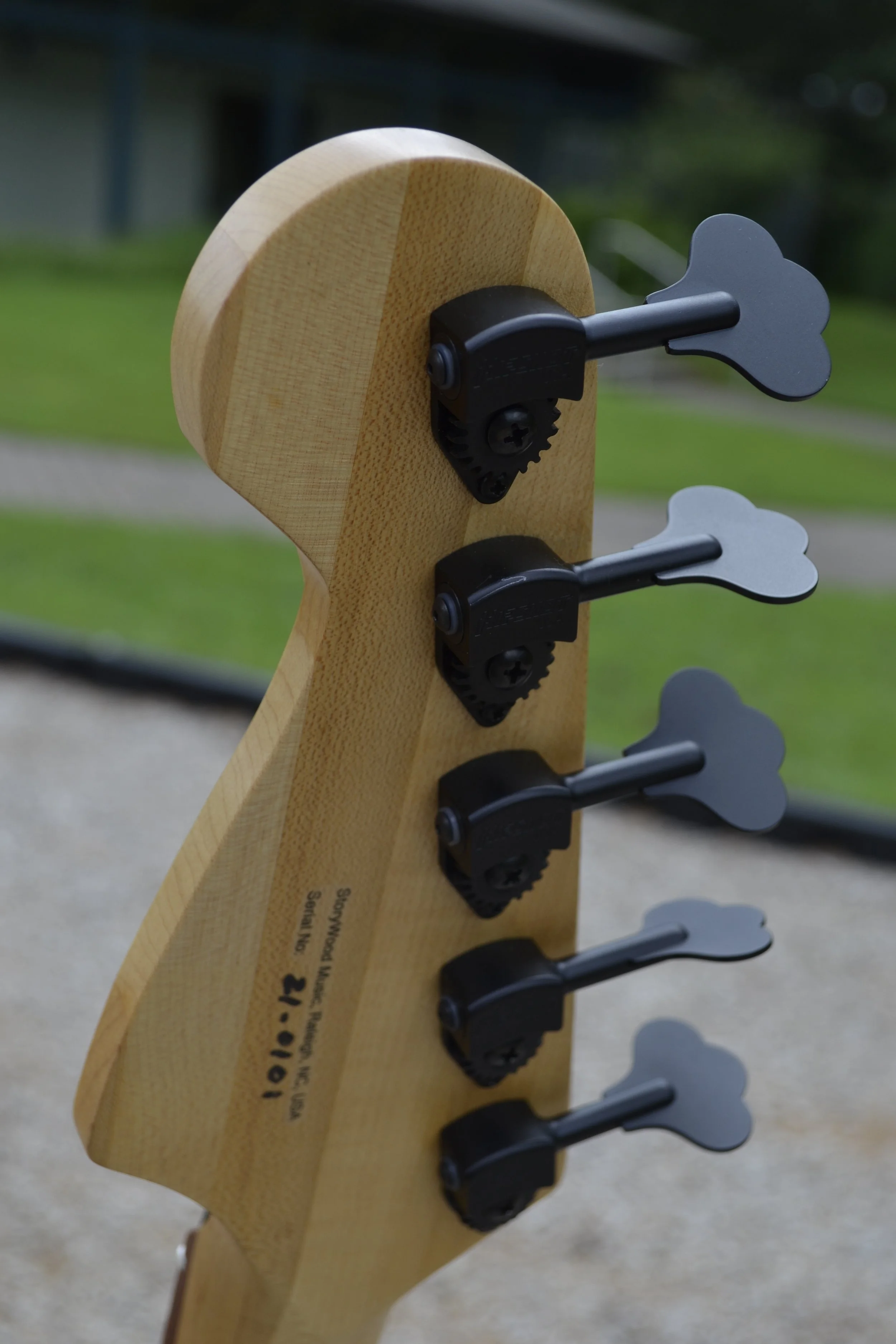 StoryWood basses benefit from a higher-mass, upgraded bridge. The natural sustain of the reclaimed body and neck wood coupled with an upgraded bridge yields increased dynamic range, sustain, and pitch stability as well as increased string vibration transference from the vibrating string to the body. StoryWood recommends one of several amazing bridges from Hipshot, Babicz or Ray Ross.